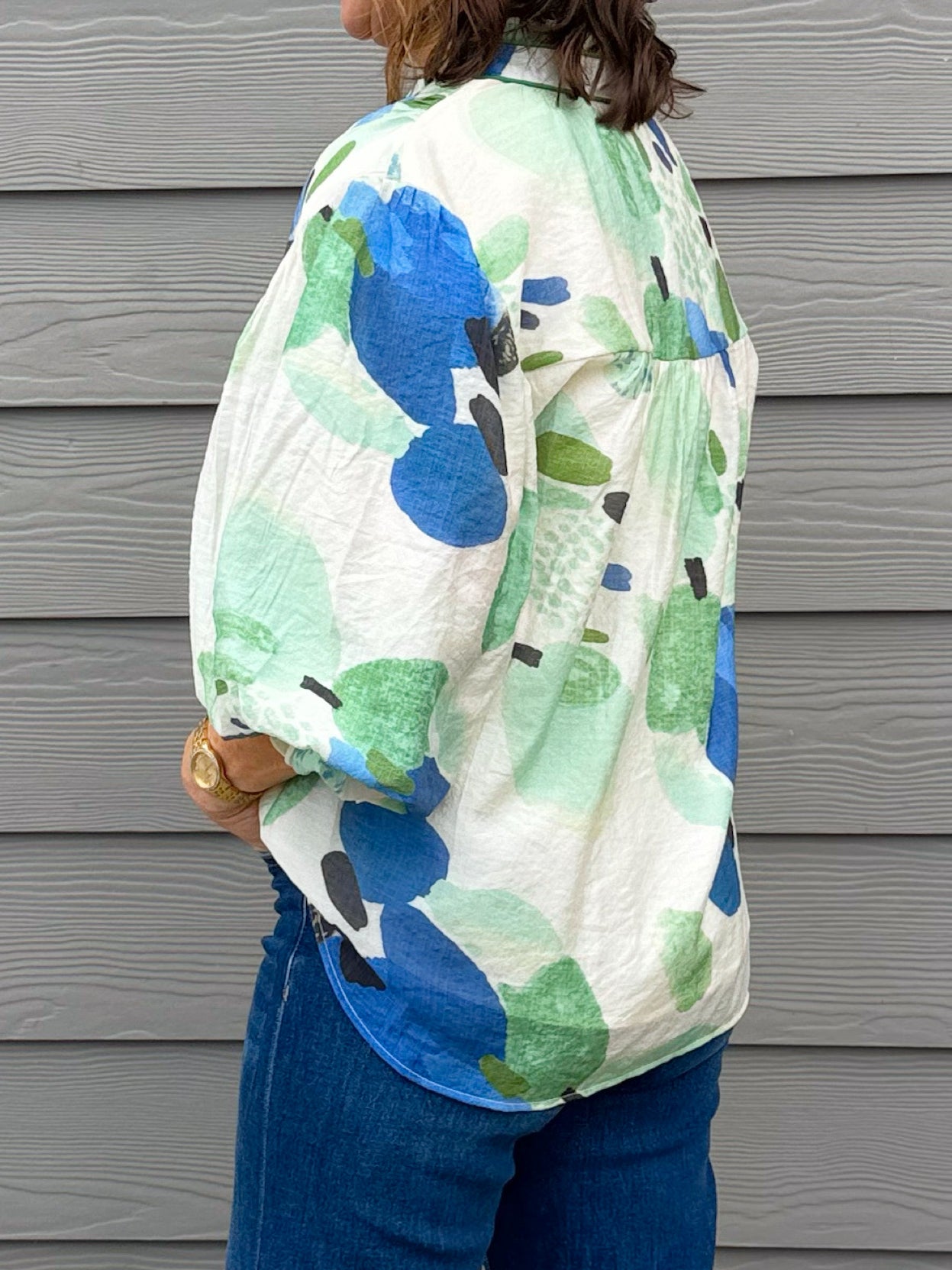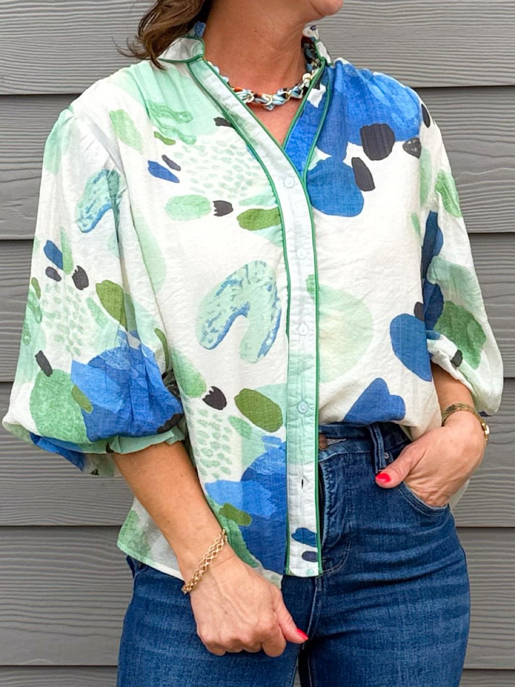 A vibrant printed blouse featuring an abstract watercolor-inspired pattern in shades of blue and green. Designed with gathered balloon sleeves and contrast piping along the neckline and button placket, this lightweight blouse adds a fresh pop of color while keeping the silhouette relaxed and easy to wear.