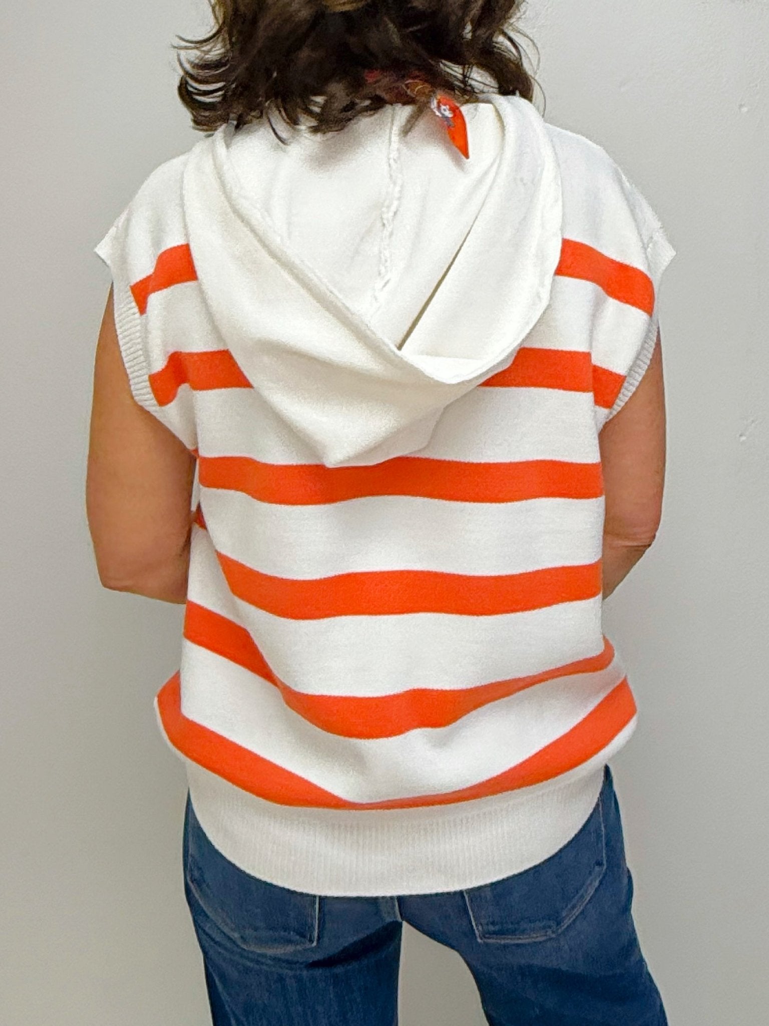 A relaxed sleeveless knit top featuring soft coral-toned stripes on a creamy background. Designed with a casual hood, button neckline, and lightweight knit texture, this easygoing piece brings effortless style to warm-weather days.