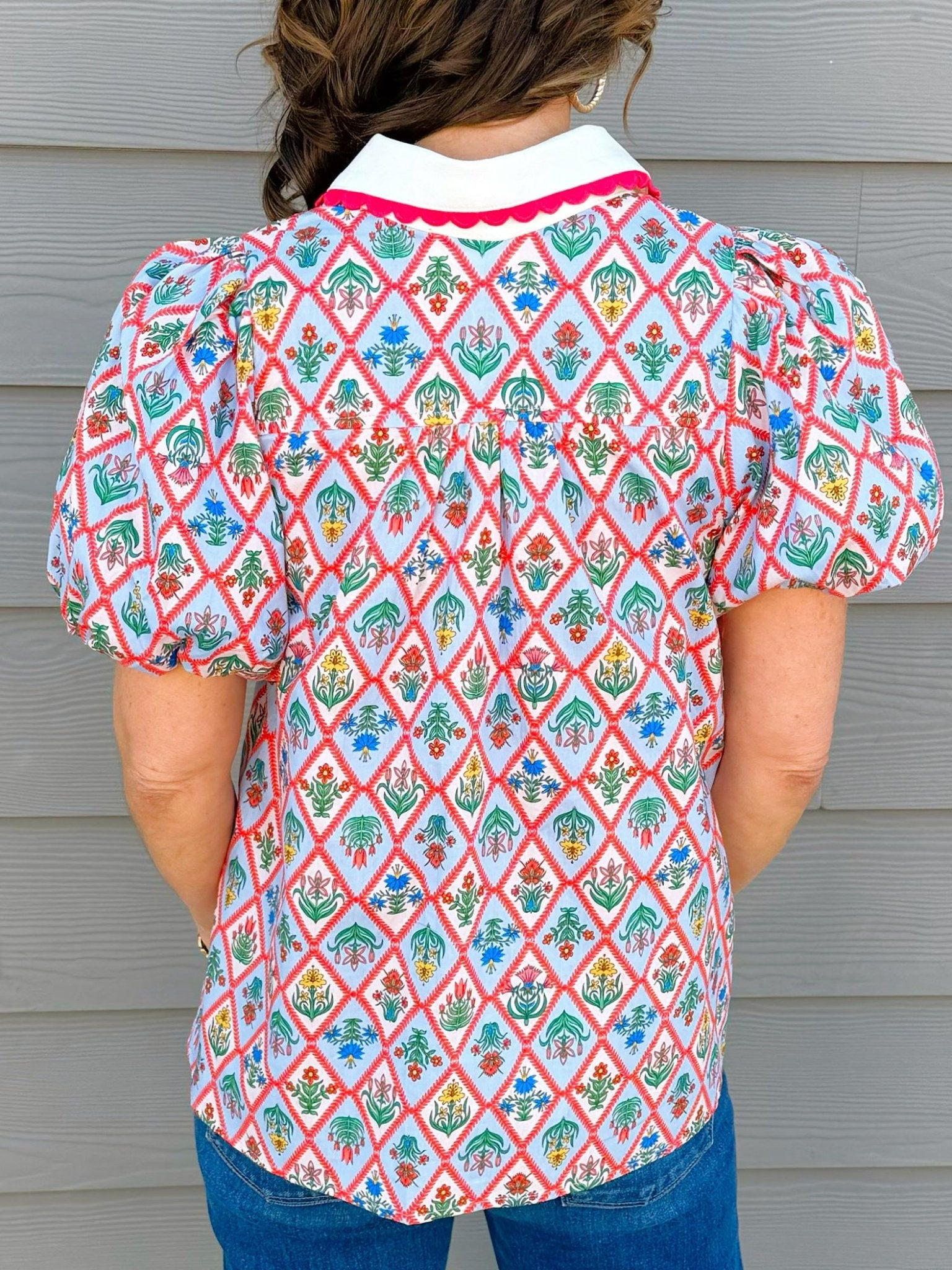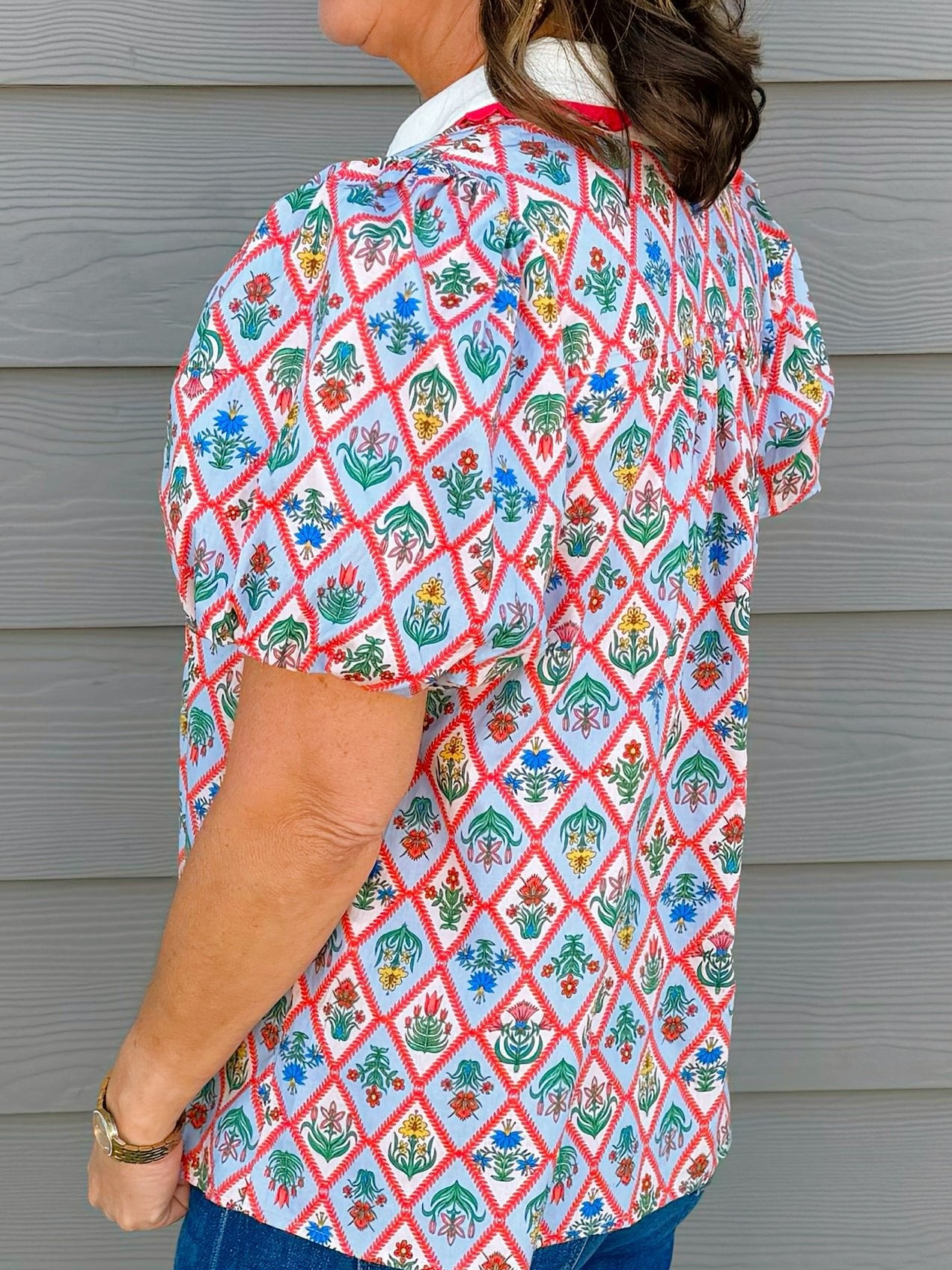 The kind of top that makes your whole outfit look intentional without even trying. A colorful diamond floral print in the prettiest periwinkle, coral, and green tones, paired with a crisp white collar and button placket for that polished contrast that just works. The puff sleeves add a little something extra that takes it from cute to "where did you get that?"