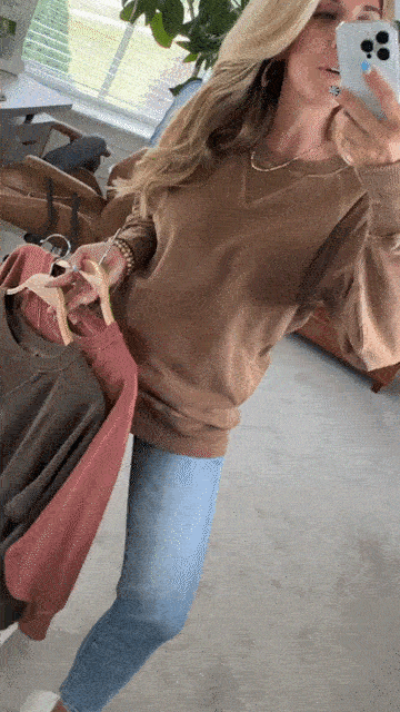 Dolman sleeved sweatshirt pullover with a ribbed detail thrown in for extra texture! Cozy, boyfriend fit makes this pullover easy to pair with denim to sweatpants! Contrast ribbing found along henley neckline, sides, cuff, and waistline!