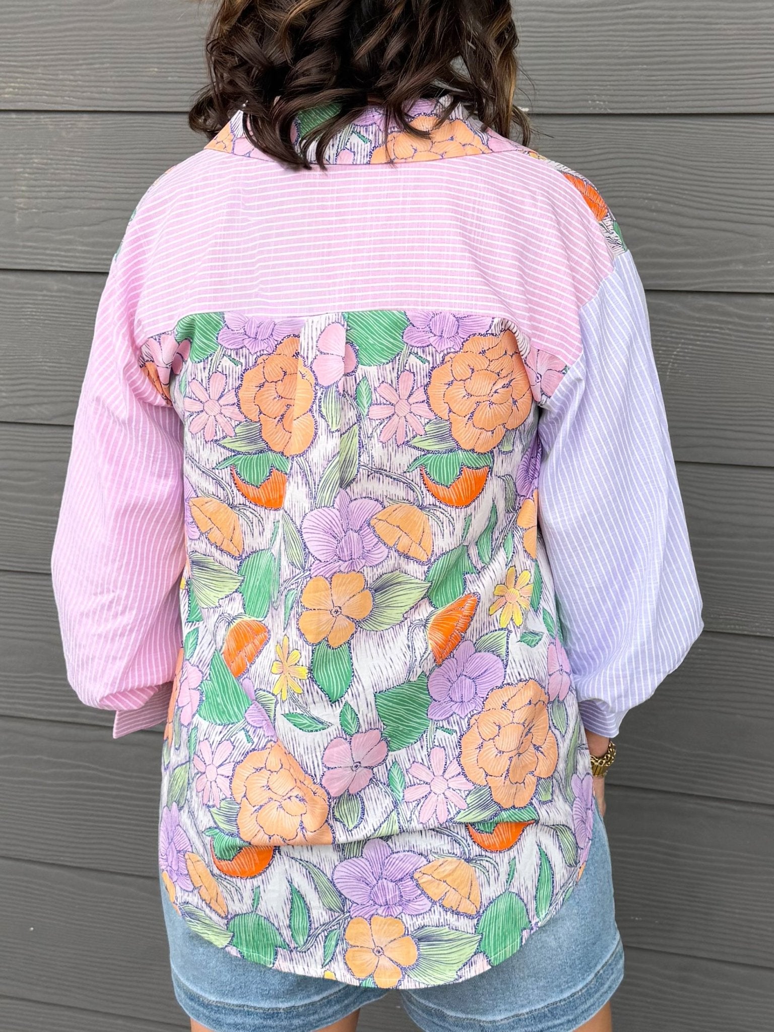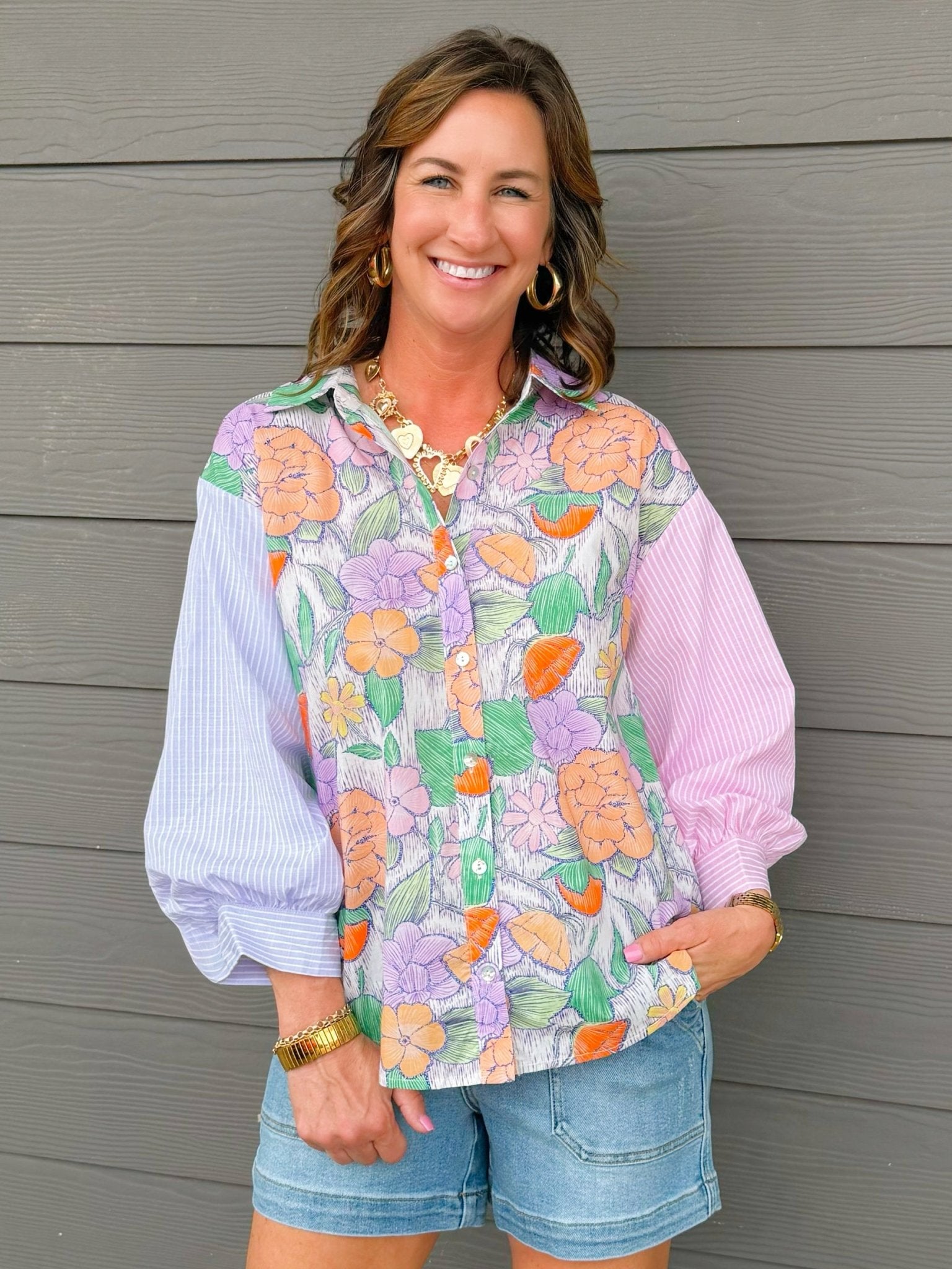 A playful button-down top featuring a mix of floral and striped fabrics with 3/4 puff sleeves for a unique, standout look.