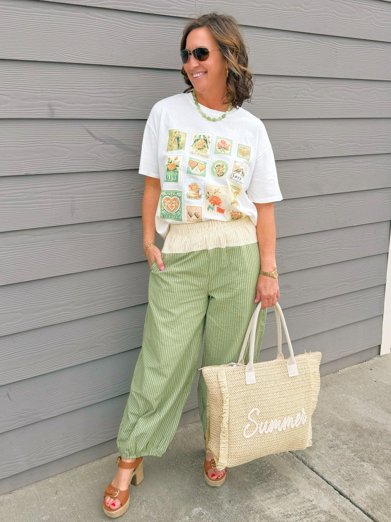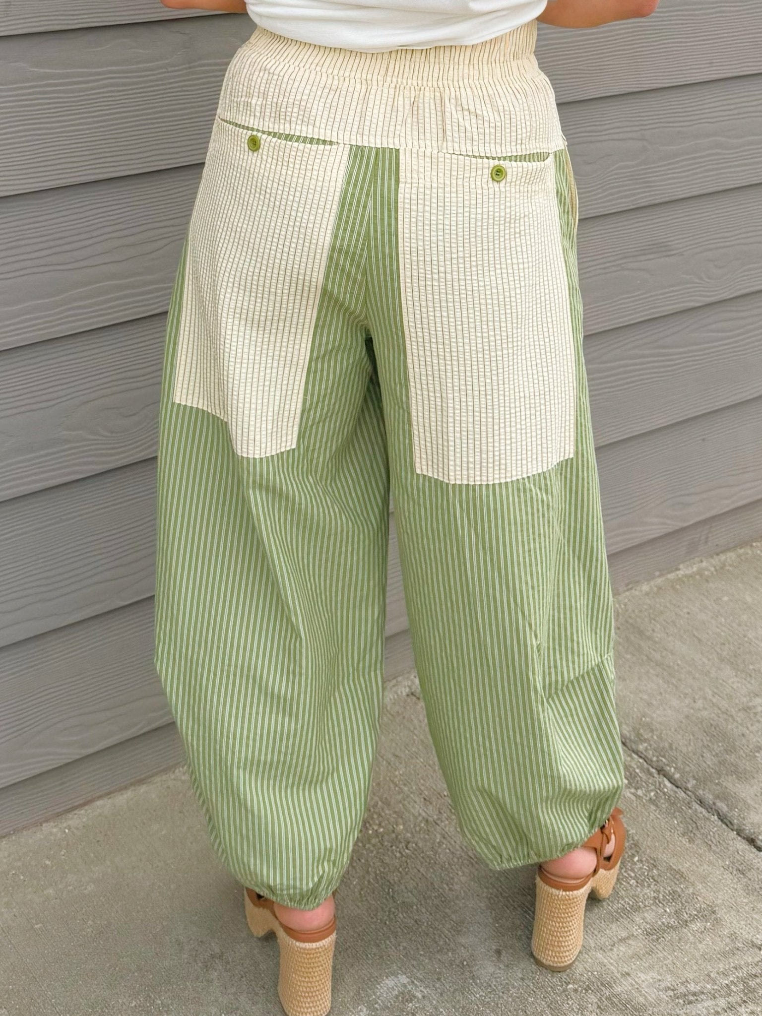 A pull-on jogger pant in a soft green stripe with a cream waistband and cream contrast pockets, featuring an elastic waist and gathered ankle detail.