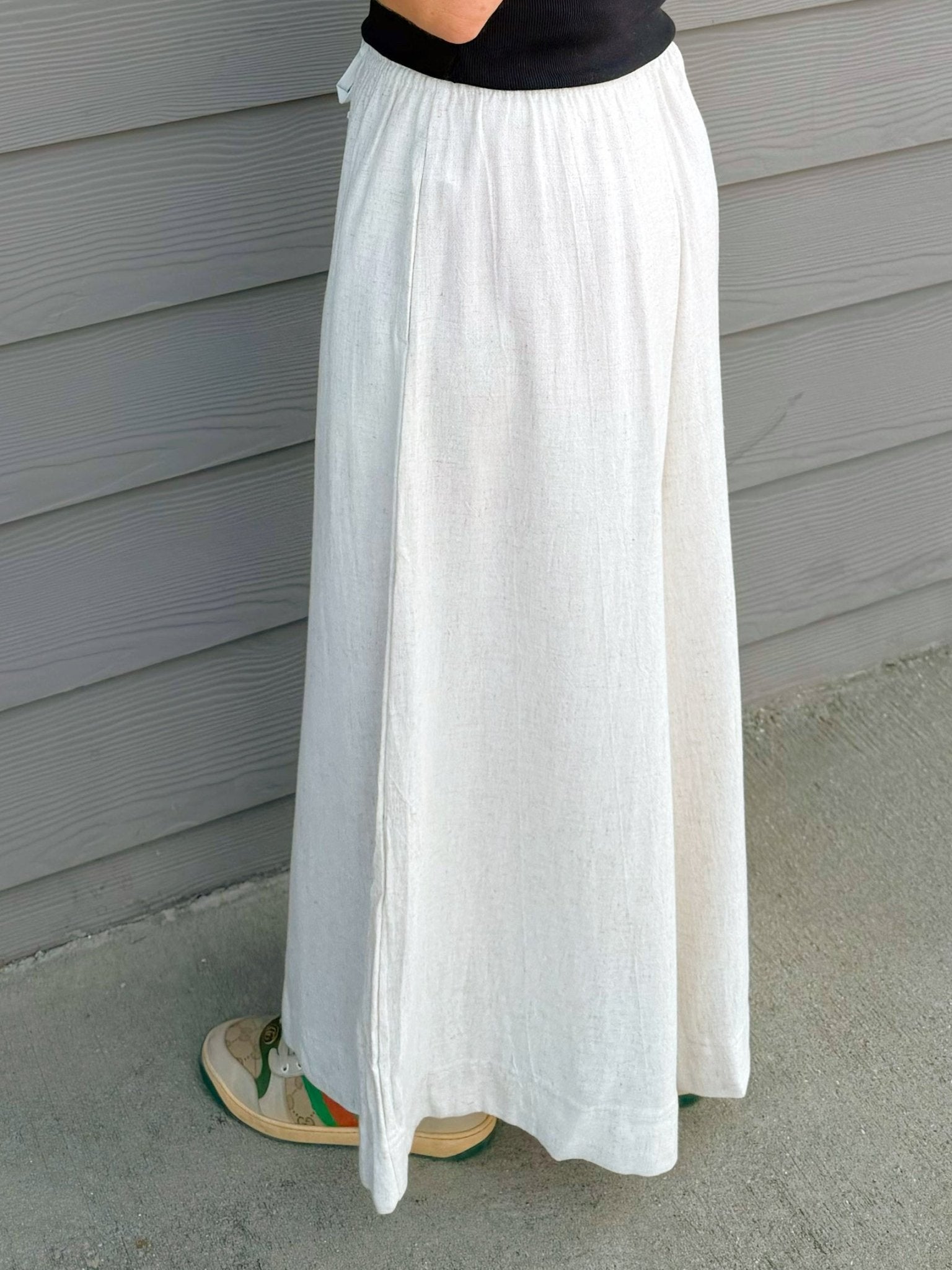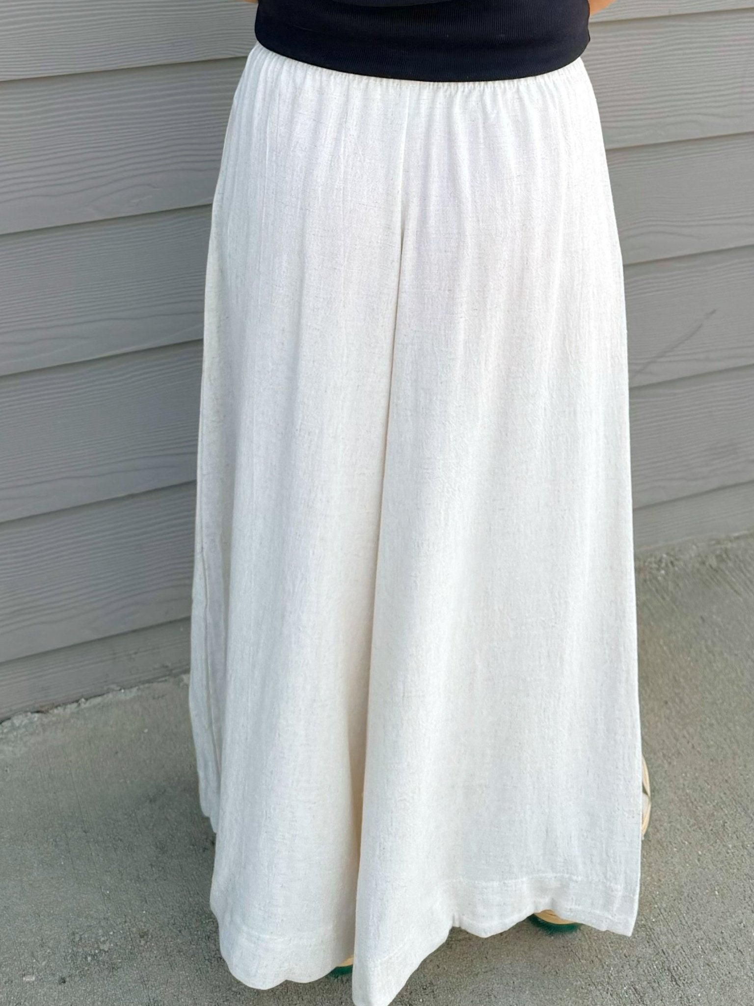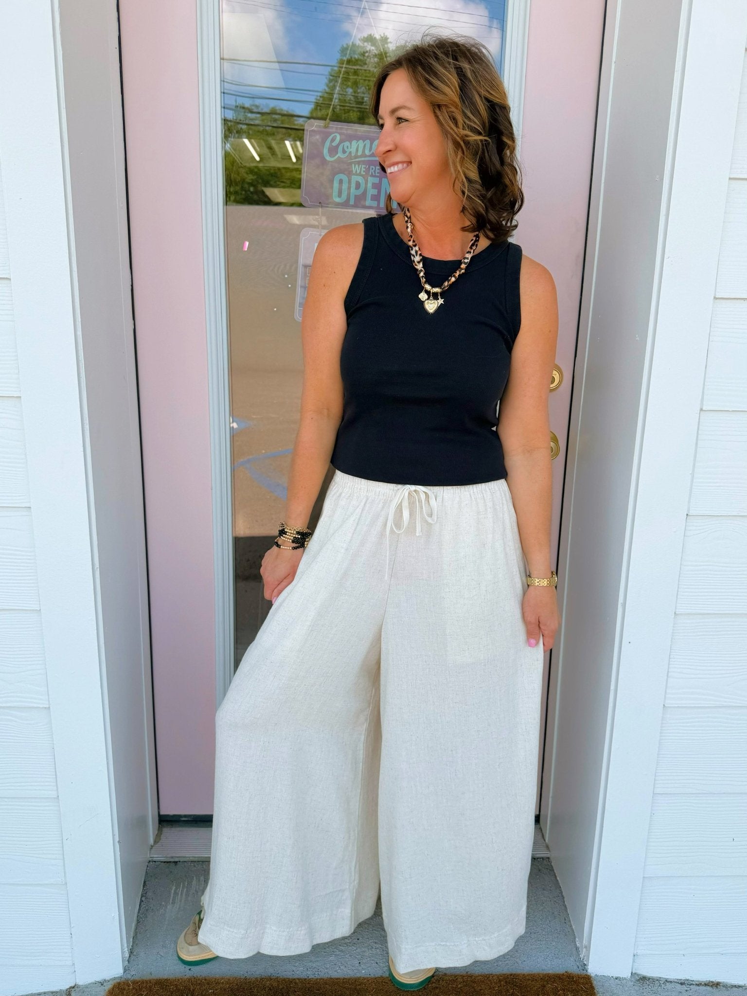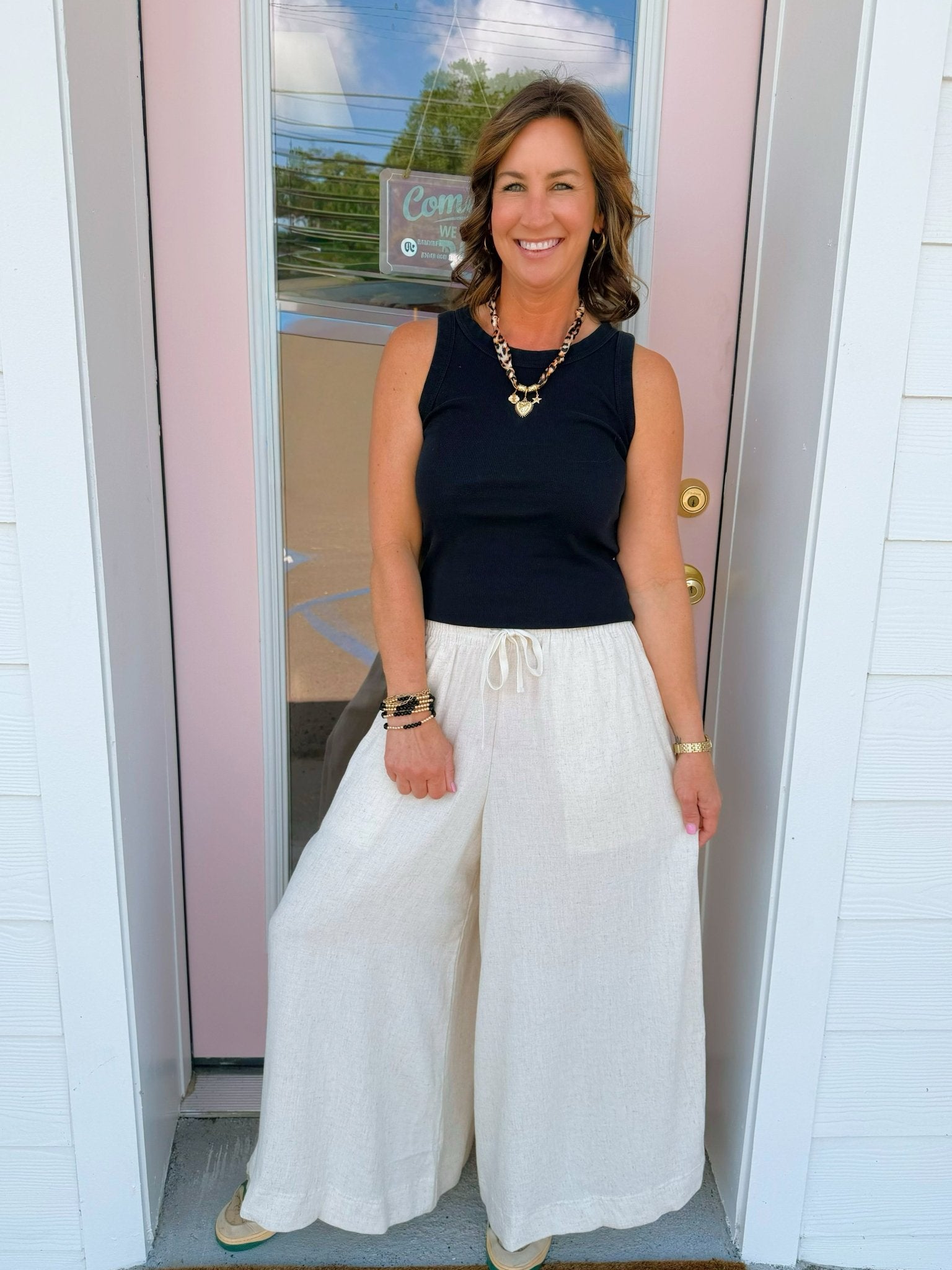 These wide leg crop linen pants are everything you want for spring and summer — breezy, effortless, and incredibly flattering. The natural cream color goes with literally everything in your closet, the drawstring waist means they're as comfortable as they look, and that wide leg silhouette gives you that relaxed, polished look that's so hard to find. Pair them with a fitted tank and sandals like shown, or dress them up with a blouse and wedges for something a little more elevated.